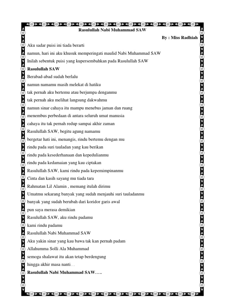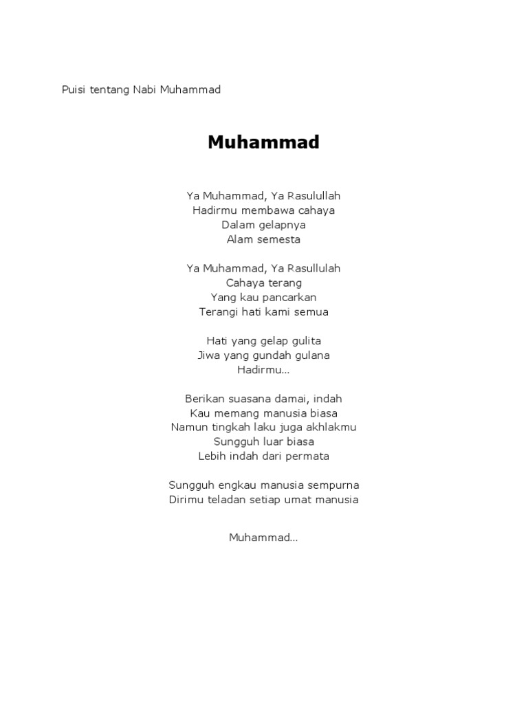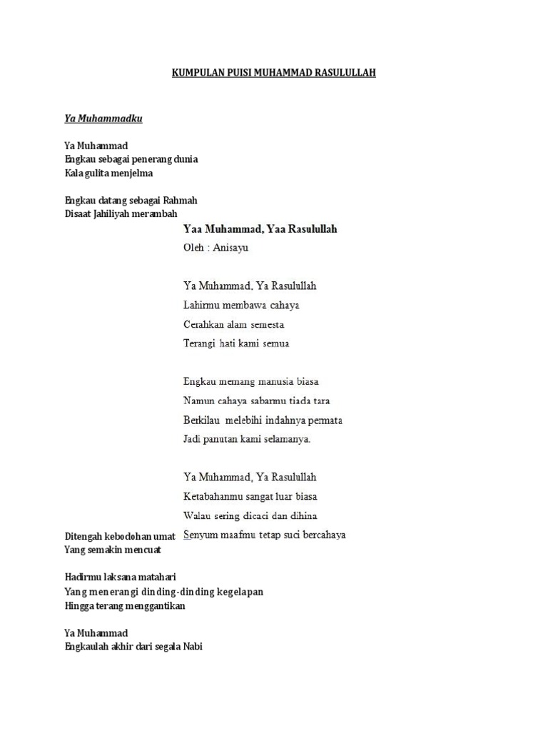 Nabi Muhammad Tauladan Seluruh Umat Puisi Untuk Nabiku Masih ingat tentang Makna Maulid Nabi Muhammad dalam Mencapai Kesuksesan merupakan artikel tentang pristiwa kelahiran nabi Muhammad SAW serta maknanya dalam kehidupan kita untuk mencapai kesuksesan. Apr 27 2017 Read Puisi HIJRAH NABI MUHAMMAD SAW from the story kumpulan puisi Islam by SitiCibitung Siti ardiyanti with 11915 reads. Umumnya pada saat puisi-puisi ini dibacakan orang-orang yang hadir bangkit berdiri dalam sikap penuh penghormatan terhadap Nabi Muhammad.