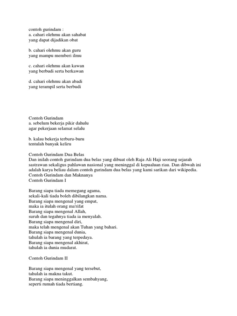 Dibawah ini adalah Gurindam Dua Belas Karya Raja Ali Haji Pasal 1 sampai 12 sebagai contoh gurindam yang dipublikasikan blog puisi dan kata bijak. Contoh Gurindam Berangkai Tentang Nasihat Pendidikan dan Maknanya Gurindam sebagai salah satu karya sastra sering kita pelajari dalam pelajaran bahasa Indonesia. Dan fitur ketiga hubungan antara baris satu dan dua membentuk kalimat majemuk.