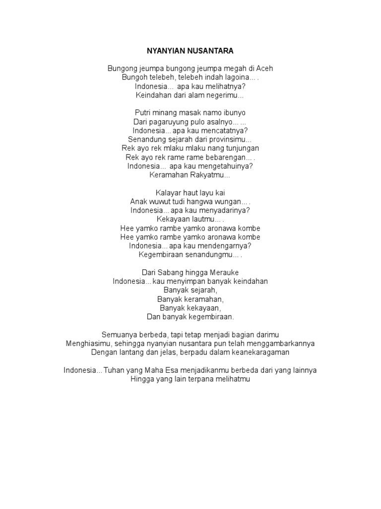Negri elok penuh pesona menebar istiadat bangsa pusaka nenek moyang kita memukau mata dunia indah ragam budaya indonesia gemulai tarian daerahnya tangkasnya pencak silat lugunya wayang golek uniknya ukiran batik merdunya suara gamelan itulah indonesia aku bangga.