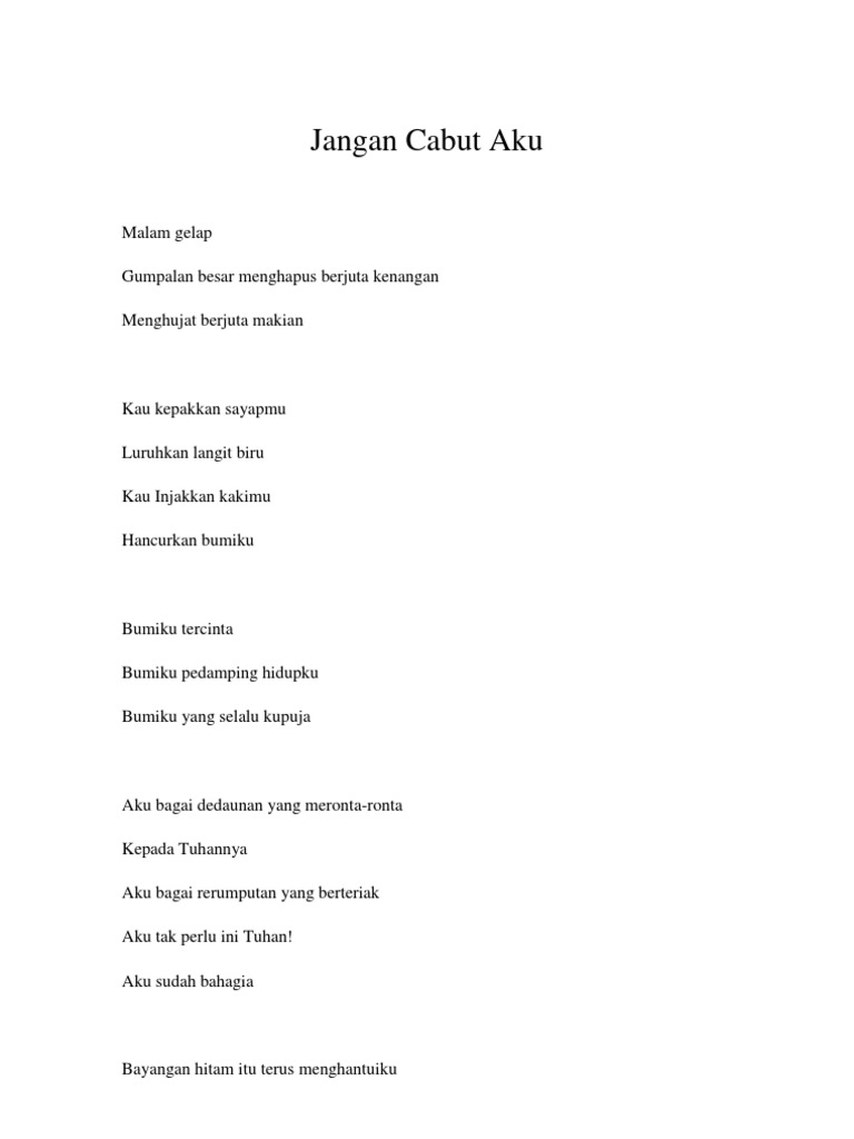 Puisi Tanpa Nama Bulan tampak mendung merenung bumi Seberkas haru larut terbalut kalut dan takut Terpaku ratap menatap jiwa-jiwa penuh rindu Hangatkan dahaga raga yang sendu merayu Bulan tak ingin membawa tertawa manja Kala waktu enggan berkawan pada hari Saat bintang bersembunyi sunyi sendiri Terhapus awan gelap melahap habis langit Bulan memudar cantik menarik pada jiwa ini Hitam. Daftar Isi Puisi Tentang Keindahan Alam. Puisi Alam Alam selalu memiliki pesona yang begitu indah.