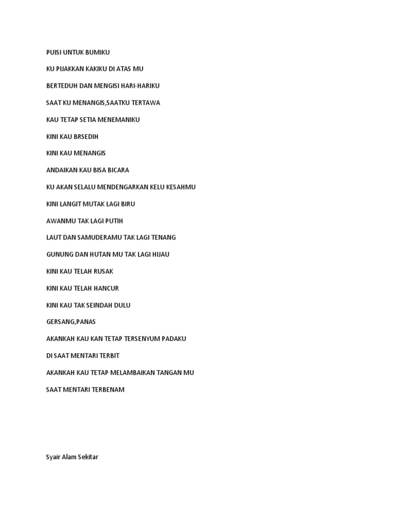 Contohnya adalah penabangan hutan secara liar dan membabi buta sehingga menyebabkan banjir di mana-mana. Kumpulan puisi puisi cinta puisi rindu puisi tentang cinta puisi romantis puisi pahlawan puisi bijak puisi indonesia contoh puisi makna puisi ibu puisi ayah kata kata puisi motivasi Puisi Islami puisi religi Puisi Kehidupan Puisi Malam Puisi pagi puisi senja puisi sedih puisi alam sajak puisi hikmah puisi bijak puisi naratif puisi indah dan menarik menyentuh hati. Dengan adanya puisi di atas semoga kita tetap menjadi orang-orang yang cinta dan peduli dengan alam sekitar.
