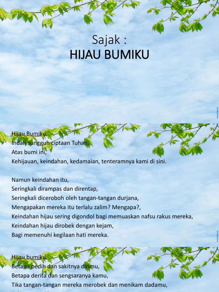 Sampai jumpa di artikel selanjutnya. Karena itu alam tampak begitu indah dan mempesona. Salah satu penggalan bait dari ketiga puisi bumi tersebut.
