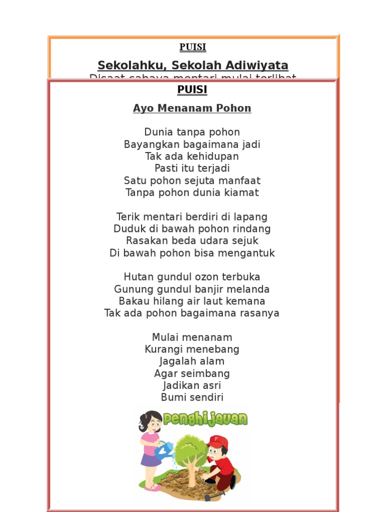 Puisi tentang lingkungan sekolah adiwiyata. Berisi puisi pendidikan pendek dan singkat terbaru 2020. Disepanjang jalan yang kususuri bersama deru angin ini ingin ku ikrarkan sebuah janji bahwaku dan hatiku akan selalu disini.