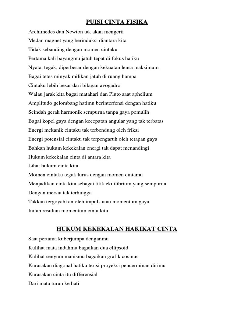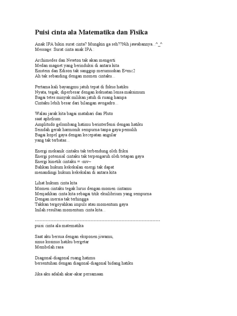 Menjadi plasma cinta. THANKYOU FOR WATCHING THIS VIDEOkita buat video ini bukan buat ngebeda2in anak ipa dan anak ips. Kumpulan Puisi Aneh Bertajuk IPA Informatika Matematika Elektro Kimia dan Accounting Surat cintanya anak IPA Archimedes dan Newton tak akan mengerti Medan magnet yang berinduksi di antara kita Einstein dan Edison tak sanggup merumuskan Emc2 Ah tak sebanding dengan momen cintaku Pertama kali bayangmu jatuh tepat di fokus hatiku.